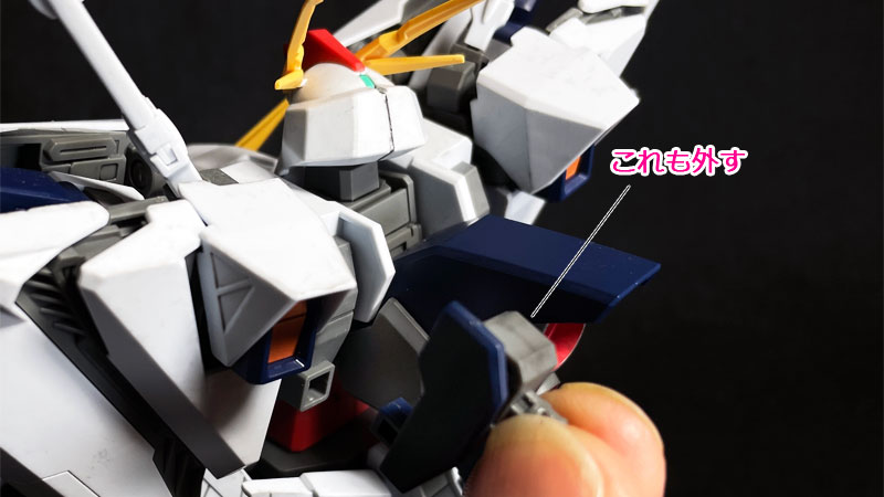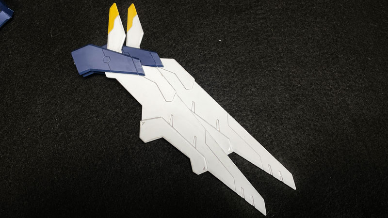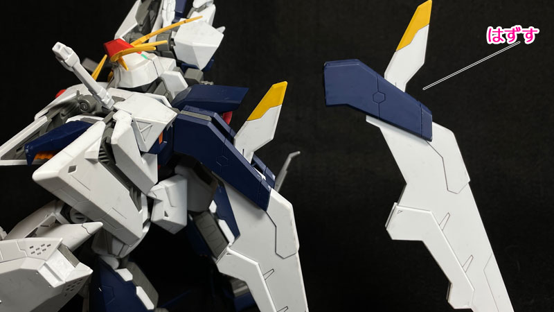 背中の翼を外します。 この翼はぱっと見左右同じように見えますが、エッジに見える模様で左右どっちなのか決められていますので、重ねて置いておくなどして、わからなくならないようにしておきます。 |