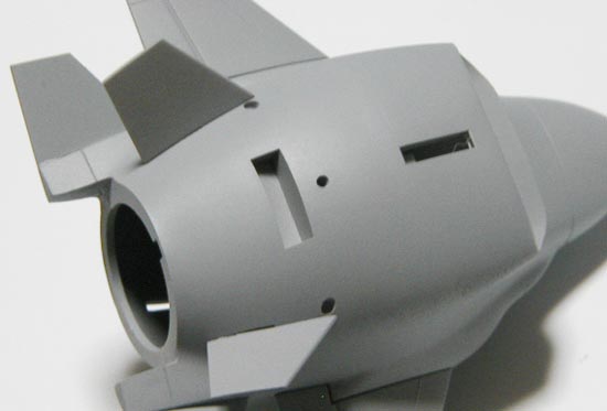 ベントラルフィン(後方の下部に付けられる補助的な翼)を接着します。この段階でサーフェイサーを吹きました。 |