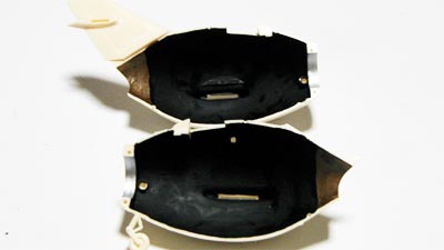 対象年齢を低年齢層に合わせた製品なのでパーツ数も少なく、接着剤は必要ですが軽快に組み立てられるたまご飛行機ですから、開設もそれほど複雑になっておりません。 まずは前述した通り、胴体の裏側を黒く塗りつぶします。この目的は、後尾部の噴射口(ノズル)がパーツなくそのまま中が見えてしまうため、です。 |
